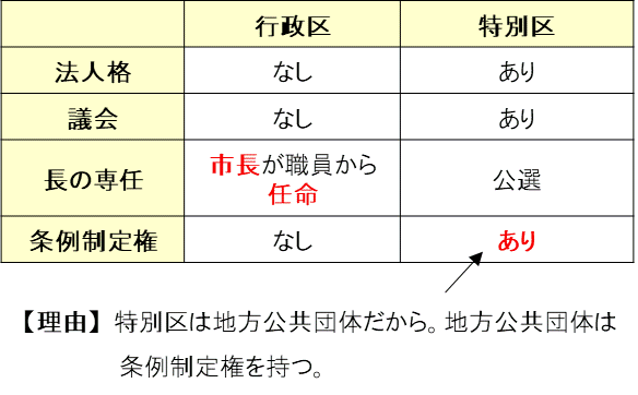 2.特別区は、独立の法人格を有する地方公共団体である点においては、指定都市に置かれる区と相違はないが、議会や公選の区長を有すること、さらには条例制定権限を有する点で後者とは異なる。