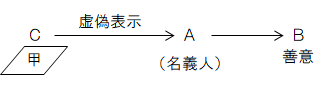 「虚偽表示」とは、嘘の意思表示をすることです。本問の「CがAに無断で甲土地の所有名義人をAとしていた」「甲土地は実際にはCの所有に属していた」というのは、甲土地の真の所有者はCであるにも関わらず、何か理由があって、甲土地の所有権をAに移した(移転させた)状況です。これは、嘘の所有権移転を行っているわけなので、「虚偽表示」に当たります。