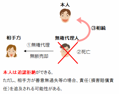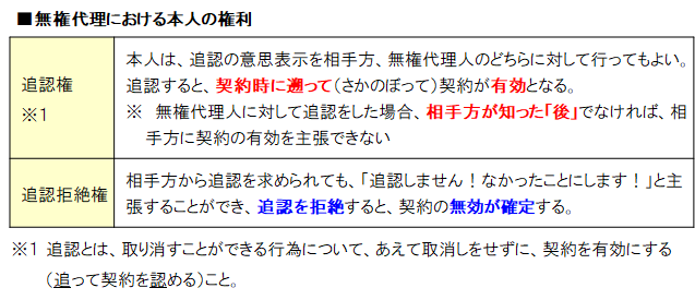 【無権代理とは】 代理権をもたない者(無権代理人)が、代理人と称して法律行為(売買等)をすることを「無権代理」と言います。無権代理が行われると、本人は困ってしまうので、下記のような権利を持ちます。