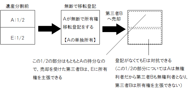しかし、各相続人の有する共有持分権の範囲を超えた分についての移転登記は無効です。つまり、Aの単独名義の所有権移転登記のうち、Aの持分については有効ですが、Eの持分については、無権利の登記で無効となります。この場合、相続人Eは自己の相続分を登記なくして第三者に対抗できます。