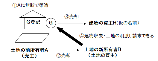 判例では、「他人の土地上の建物の所有権を取得した者(G)が自らの意思に基づいて所有権取得の登記を経由した場合には、たとい建物を他(H)に譲渡したとしても、引き続き右登記名義を保有する限り、土地所有者(新所有者B)に対し、右譲渡による建物所有権の喪失を主張して建物収去・土地明渡しの義務を免れることはできないものと解するのが相当である」としています。