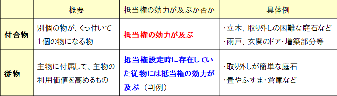 「付合物」は、別個の物が、くっ付いて1個の物になる物を指し、例えば、「立木」や「取り外しの困難な庭石」は、土地にくっついているので「付合物」です。