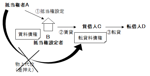 - 抵当不動産が転貸された場合、抵当権者は、原則として、転貸料債権(転貸賃料請求権)に対して物上代位権を行使することができる。