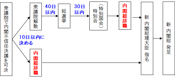 内閣は、衆議院で不信任の決議案を可決し、又は信任の決議案を否決したときは、十日以内に衆議院が解散されない限り、総辞職をしなければならない。