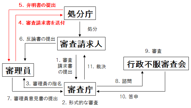 処分が行われ、その処分に不服があると、下記流れで審査請求が行われます。