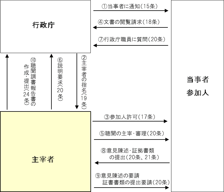 上図をご覧ください。行政庁は、不利益処分を行う前に、①当事者に対して、聴聞の通知を行います。その後、②行政庁は、職員の中から主宰者(聴聞の運営を行う者)を指名します。また、③主宰者は必要に応じて、参加人の参加許可を行います。