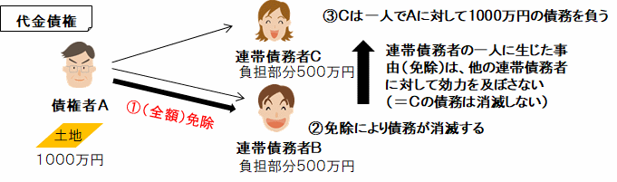 債権者Aが連帯債務者Bの債務を免除すると、免除されたBの債務は消滅します。すると、Cは一人で債権者Aに対して1000万円の債務を負うこととなります。もし、Cが1000万円をAに弁済した場合、Cは「免除で債務を免れた連帯債務者B」に対して「負担部分である500万円は返して!」と求償(請求)することはできます。(BC間での求償権は残る)・・・Bは免除を受けても、Cに求償されることになるので、Bは、結果的に負担部分の責任は負います。