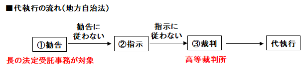 そして、代執行の対象となるのは、長の法定受託事務に限られます。(自治事務については代執行できない
