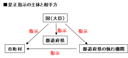 是正指示は、地方公共団体の法定受託事務の処理が、「法令違反していると認めるとき」、又は「著しく適正を欠き、かつ、明らかに公益を害していると認めるとき」に行うことができます。