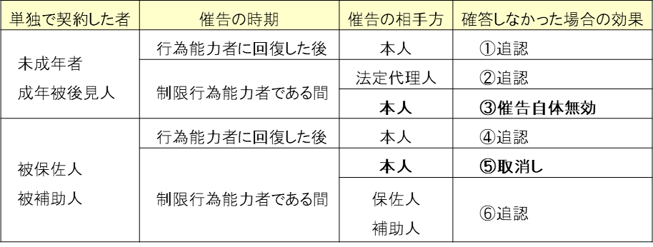 一方、⑤について被保佐人や被補助人に対して催告した場合、催告を受ける権利はありますが、確答しない場合、「取り消し」とみなされます。