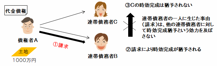 債権者Aが連帯債務者Bに「請求(裁判上の請求や催告) 」をすると、直接請求されたBの時効完成が猶予されます。