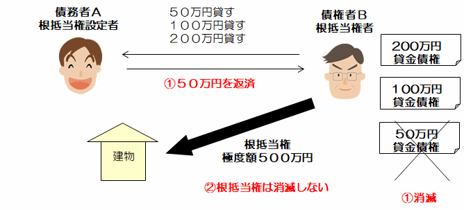 そのことによって根抵当権が消滅してしまったら、「200万円の貸金債権」と「100万円の貸金債権」が無担保になってしまいます(保証がなくなってしまう)。
