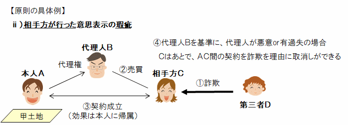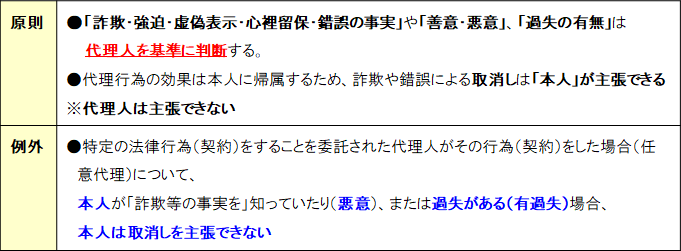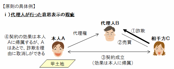 『「代理人や相手方」が詐欺や強迫を受けて契約(代理行為)をした場合』や、『虚偽表示、心裡留保、錯誤によって契約すること』を「代理行為の瑕疵(かし)」と言います。瑕疵とは、欠陥・キズという意味です。